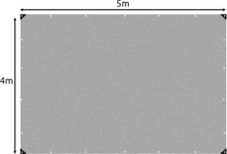Hjørnerne er forstærket med plastbeskyttere, og langs kanten er der rustfri øjer Ø 12 mm placeret for ca. hver 100 cm – ved størrelsen 4 × 5 m i alt 18 øjer. Presenningen kan bruges på begge sider og er ideel som midlertidig overdækning, materialebeskyttelse, dækning af last eller vejrbeskyttelse.