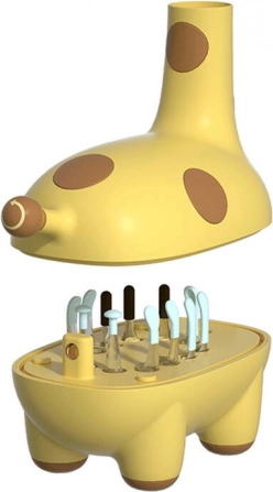 Den stiliserede beholder formet som en hammerhaj fungerer som praktisk opbevaring til alle tilbehør, hvilket tilføjer både leg og funktionalitet.