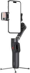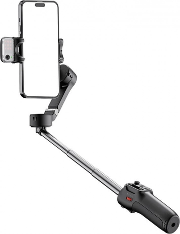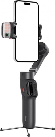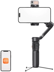 Gimbalen er let og nem at transportere takket være det sammenklappelige design. Den integrerede, 205 mm udtrækkelige stang muliggør bredere vinkler, og fjernbetjeningen kan bruges separat eller monteret, hvor den også oplades.