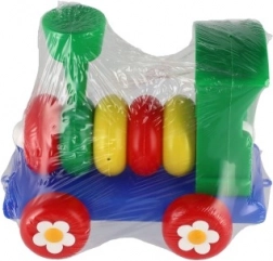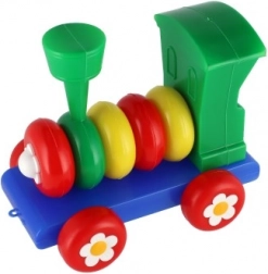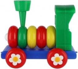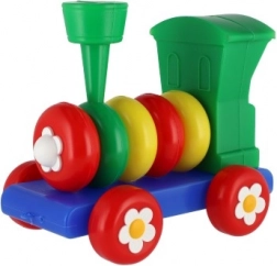 Lokomotivet er lavet af plast i iøjnefaldende farver, der tiltrækker børns opmærksomhed, og dekoreret med blomstermotiver på hjulene.