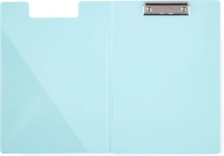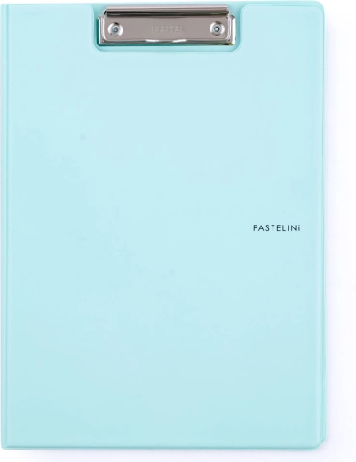 Moderne lukbar skriveunderlag med metalclips i pastelgrøn farve, fremstillet af ekstra kraftig karton med indre gennemsigtig lomme.