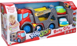 Med dette Kiddy autotransporter-sæt får børn masser af realistisk leg. Transporteren med to platforme og vipbar rampe gør det let at laste de medfølgende biler, mens lys- og lydeffekter giver en autentisk stemning. Takket være friløbshjulene bevæger køretøjerne sig glat hen over gulvet.