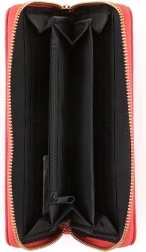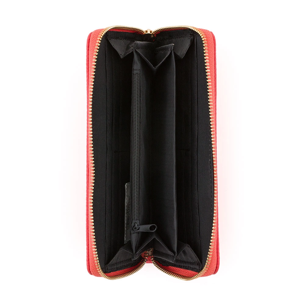 Stor damepung i koralfarve. Indvendigt er der 8 mindre lommer til loyalitetskort, 2 større lommer, 3 adskilte rum til kontanter og 1 lynlåslomme til småmønter.
