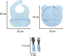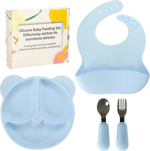 Sættet er fremstillet af kvalitets, fødevaregodkendt silikone uden skadelige stoffer; det er blødt at røre ved, holdbart og let at rengøre. Den inddelte tallerken i bjørneform gør serveringen overskuelig, hagesmækken med dyb lomme holder tøjet rent, og det ergonomiske bestik med bløde silikonehåndtag passer til små hænder.