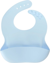 Blød silikonehagesmæk med justerbar lukning og dyb lomme opfanger pålideligt både krummer og væsker og beskytter tøjet ved hvert måltid.