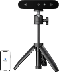Avanceret bevægelsessporing sikrer stabil scanning selv af levende objekter. Scanneren klarer mørke og metalliske overflader uden spray og tilbyder enkel eksport til OBJ, STL og PLY.