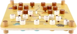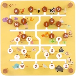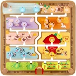 Smart og sjovt redskab til førskolebørn: den dobbeltsidede plade rummer to verdener. På bondegården flytter børn brikker med dyr, ansigter og frugter langs fræsede baner til deres plads. Ved at vende pladen bliver den til en alfabetlabyrint – opgaven er at føre brikken med begyndelsesbogstavet hen til det rigtige dyr (navnene er på engelsk), så bogstaver og ordforråd øves på legende vis.