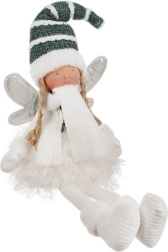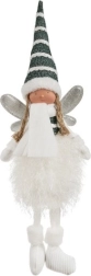 Feen er koordineret i hvid, mørkegrøn og sølv, så den passer ind i både moderne og traditionelle arrangementer. Vinterudstyr i form af strikket hue, halstørklæde og små støvler understreger sæsonpræget, og takket være de kompakte mål kan den placeres overalt – i entréen, stuen eller under juletræet.