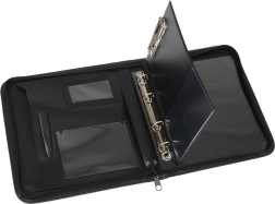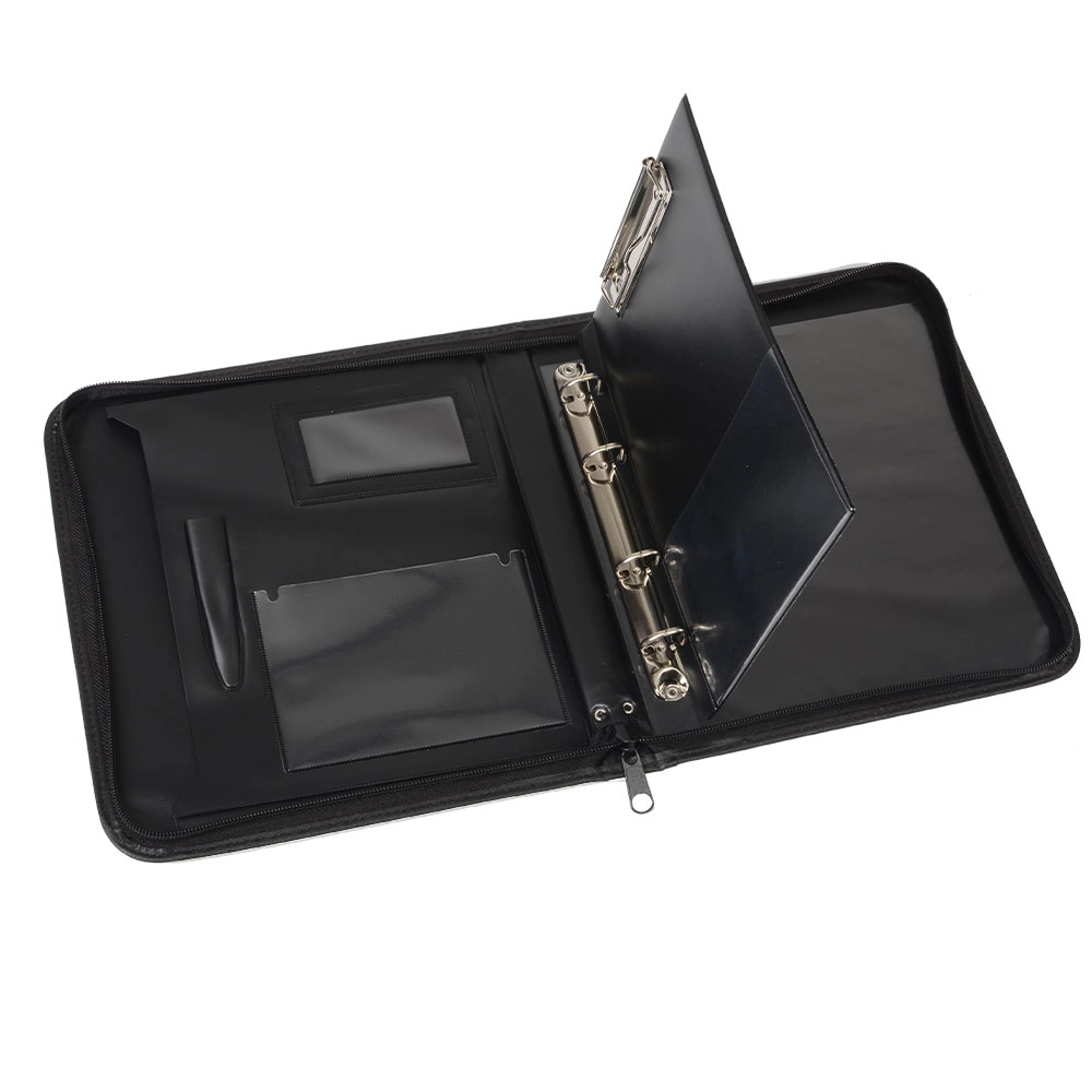 Denne stilfulde A5-dokumentmappe i mat sort holder dine materialer sikkert samlet takket være den praktiske lynlås. Det indvendige layout med lommer til dokumenter og visitkort samt holder til skriveredskaber giver dig perfekt overblik og hurtig adgang.