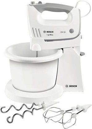 Denne praktiske håndmixer med stativ og roterende skål sikrer stabil og komfortabel piskning og æltning uden anstrengelse. Det ergonomiske design med blødt greb og store knapper giver komfort i daglig brug, mens den støjsvage og kraftige 450 W motor klarer både lette cremer og tunge deje.