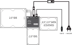 - 2,5"/3,5" SATA HDD/SSD, 2,5"/3,5" IDE HDD, optiske IDE/SATA-drev (CD/DVD)