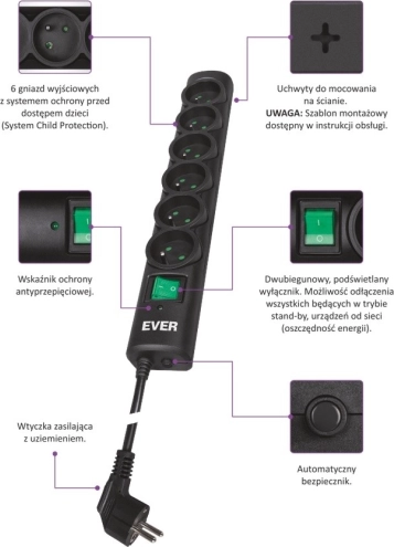 Overspændingsbeskyttelse Ever Optima, en sikker løsning til husholdnings- og kontorapparater med en kabellængde på 1,5 m.