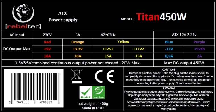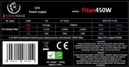 REBELTEC Titan 450 er en universel ATX-strømforsyning til dagligdags og multimedie-pc'er. Takket være maksimal effekt på 450 W og den store 120 mm blæser arbejder den stille og effektivt, mens den termiske kontrol automatisk tilpasser blæserhastigheden til den aktuelle belastning.