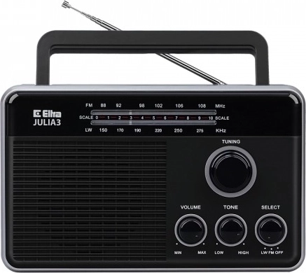 Nyd klar og behagelig radiolytning med Julia 3. Den store, overskuelige skala og de ergonomiske betjeningsknapper gør det nemt at indstille stationer og lydstyrke. Med den drejbare teleskopantenne får du stabil modtagelse, og toneindstillingen lader dig tilpasse lyden efter dine præferencer.