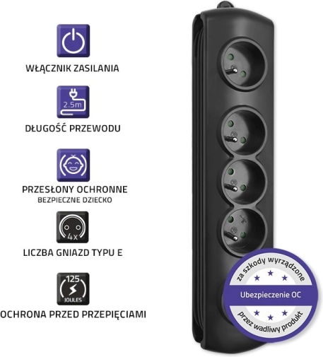Betjeningen er maksimal bekvem takket være den baggrundsbelyste fodafbryder Quick Switch – med ét tryk slukker eller tænder du strømmen til alle tilsluttede enheder. Sikkerheden sikres af overspændingselementer (varistor), børnesikringer i alle stik og ikke-brændbar udførelse i PP.
