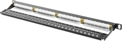 Med 24 uskærmede RJ-45-porte i kategorien Cat.5e er det ideelt til data- og telekommunikationsapplikationer. Universelle IDC/LSA-klemmer kompatible med standarderne T568A/B muliggør hurtig og sikker installation, mens den medfølgende kabelorganisator holder føringen fast og æstetisk.