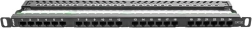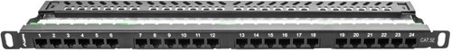 Professionelt patchpanel til 19" rack med 24 RJ-45-porte i kategorien Cat.5e og en højde på 0,5U. Tilbyder hurtig og overskuelig kabelhåndtering, nummererede porte for nem orientering og IDC/LSA-klemmer kompatible med T568A/B for hurtig installation. Inkluderer kabelorganisator og en robust sort finish RAL9004.