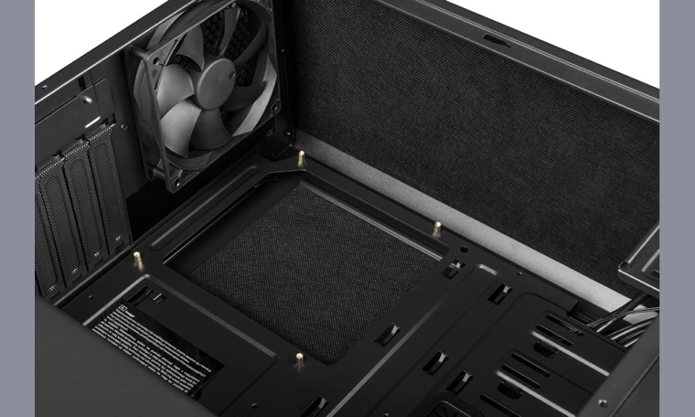 Det indre er designet til og fleksibilitet: understøttelse af op til fem blæsere (2× front, 2× top, 1× bag – 2× 120 mm installeret fra fabrikken), kompatibilitet med vandkøling og gennemtænkt tunneldækning til PSU og 3,5" drev. Let aftagelige støvfiltre (magnetisk top, nederst ved strømforsyning samt front) holder det rent og temperaturerne stabile.