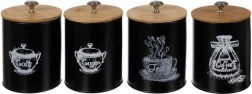 Sættet indeholder fire dåser mærket med 'Salt', 'Sukker', 'Te' og 'Kaffe', hvilket hjælper med at holde indholdet organiseret og let tilgængeligt. Takket være metalgrebet på låget er åbning og lukning af dåserne nemt og bekvemt.