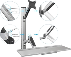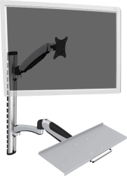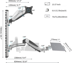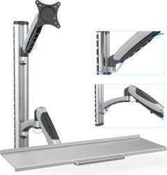 Den effektive vægmonterede arm gør det muligt at installere en skærm eller fjernsyn og et tastatur, hvilket sikrer maksimal fleksibilitet og komfort på arbejdet eller i hjemmet. Den er udstyret med VESA-standard huller (75x75, 100x100), hvilket tillader montering af skærme op til 27" og vægt op til 8 kg. Armen kan dreje skærmen 360 grader og tilbyder omfattende muligheder for horisontal og vertikal justering. Derudover er den udstyret med et integreret kabelstyringssystem, der sikrer et rent og organiseret rum. Fremstillet af kvalitetsmaterialer med grå pulverlakering.