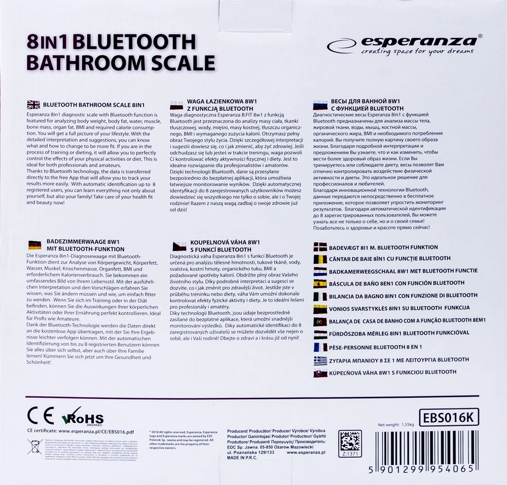Oplev den innovative personvægt Esperanza "8-i-1" B.FIT, som bruger BIA-teknologi (bioelektrisk impedans) til præcis analyse af kropssammensætning. Hurtige og nemme målinger giver alle de vigtige oplysninger til overvågning af helbredstilstanden.
