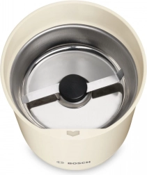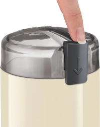 Vi præsenterer en flødefarvet kaffekværn udstyret med knive i rustfrit stål af høj kvalitet, som giver præcis og fin kværning. Den enkle og sikre mekanisme gør, at kværnen kun kører med låget lukket, og den er udstyret med en knap, der forhindrer utilsigtet start.