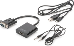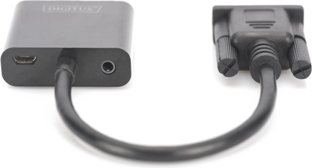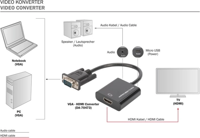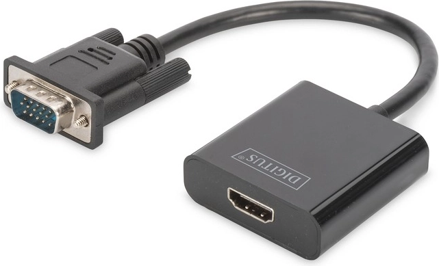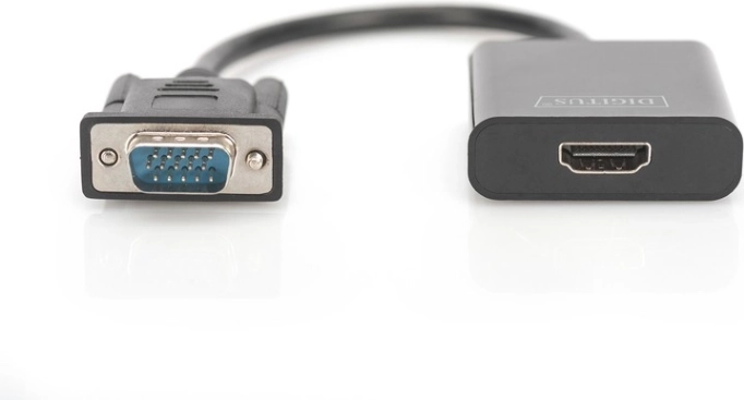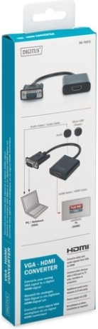Konvertering af det analoge VGA-signal til et digitalt HDMI-signal gør det muligt at forbinde enheder med kun VGA-udgang til for eksempel en skærm, tv eller projektor med HDMI-indgang. Da VGA-indgangen kun kan overføre videosignal, er konverteren også udstyret med et 3,5 mm lydstik. Dette sikrer, at eventuelle stereosignaler også konverteres og integreres i HDMI-videoen, så afspilning via HDMI er mulig for eksempel på dit tv.