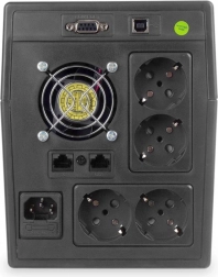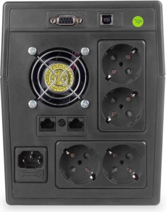Bagsiden af UPS'en er udstyret med flere stikkontakter, kommunikationsporte og en køleventilator, hvilket giver større tilslutningsmuligheder og fleksibilitet i brugen.