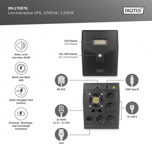 UPS Line-Interactive fra Digitus tilbyder kompakte mål og sikrer høj pålidelighed og ydeevne takket være mikroprocessorstyring. Den er nem at betjene og giver effektiv beskyttelse af hjemme- eller kontorcomputersystemer mod datatab og skader.