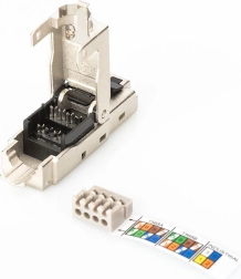 Modulær RJ45-stik DIGITUS kat. 6A til montering på kabler med AWG 22-27 tilbyder 10GBit Ethernet og PoE+-understøttelse, hvilket sikrer pålidelig dataoverførsel selv under de mest krævende forhold.