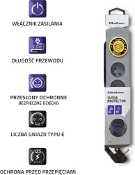 Fokus på sikkerhed sikres af overspændingsbeskyttelse med varistor, som beskytter elektronikken ved pludselige spændingsspidser, børnesikringer i alle stik og flammehæmmende PP-materiale. Den praktiske løsning med mulighed for montering på møbler samt føring eller omvikling af overskydende kabel hjælper med at holde orden og fri plads.