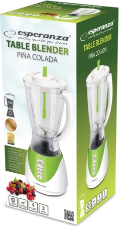 Den praktiske bordblender Esperanza Pina Colada tilbereder hurtigt smoothies, cocktails og milkshakes og klarer også knusning af is. Takket være 350 W effekt, 3 hastigheder og Turbo-funktion opnår du en glat konsistens på ingen tid. Rustfri stålknive, 1,5 l plastbeholder og skridsikre sugekopper sikrer sikker og komfortabel brug.