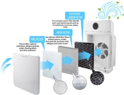 Enheden absorberer effektivt formaldehyd, benzen, xylen og andre skadelige gasser og fjerner desuden ubehagelige lugte. Negative ioner genereret af denne luftrenser kan neutralisere positivt ladede partikler af støv og røg og eliminerer dermed effektivt bakterier og vira.
