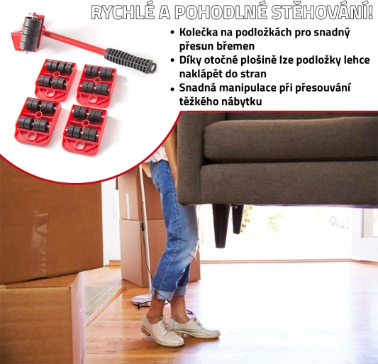 Sæt til flytning af møbler 5-i-1 med bæreevne 150 kg. Løftearm og 4 transportruller med skridsikker belægning og 360° rotation for nem og sikker flytning.