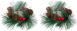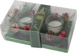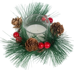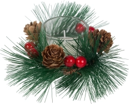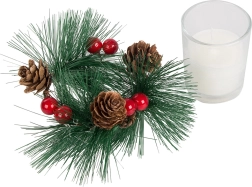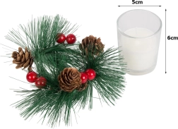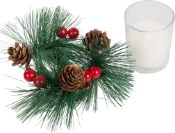 Disse dekorative lys i stil med en juleudsmykning er et perfekt tilbehør til din festlige bord eller hylde. Grankviste, kogler og røde bær omkring glasset tilføjer det naturlige julemagiske præg.