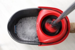 Sættet indeholder en spand med slynge-/rotationsmekanisme, som gør det nemt og hygiejnisk at vride moppen uden berøring.