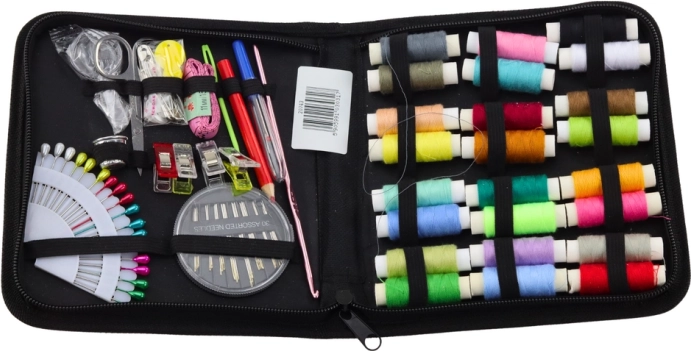 - Indhold i sættet: 24 farvede tråde og spoler, hvide knapper, farvede knappenåle med hoveder, clips, nåle i rundt etui, tråder (nåletråder), metalfingerbøl, opsprætter, saks, hæklenål, pincet i plast, målebånd og skrædderkridt.