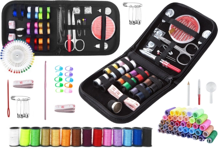 I sættet finder du et bredt udvalg af værktøjer til almindelig syning: farvede tråde, flere nåle, saks, opsprætter/sytrådsfjerner, sikkerhedsnåle, knapper, målebånd samt evt. små dele til nemmere trådning og markering. Derfor er sættet velegnet til både begyndere og erfarne brugere.