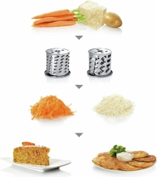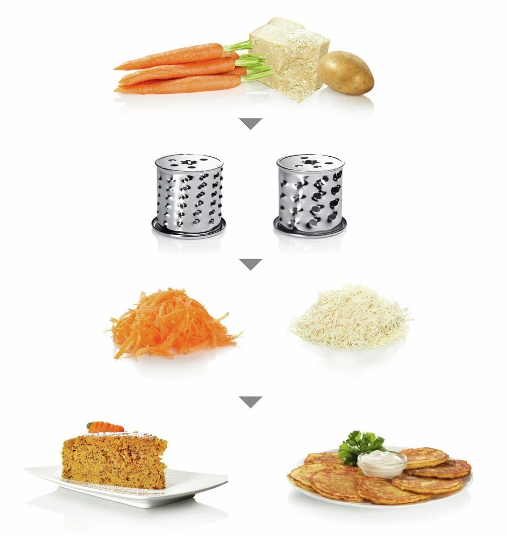- Klingefunktionerne (mere end 10 funktioner) muliggør hakning af kød og fisk samt rivning af grøntsager, frugt, oste og mere