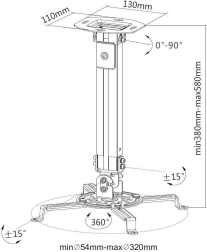 Universal loftbeslag til projektorer med justerbar længde 38–58 cm i elegant sølvfarvet udførelse. Sikker stål‑aluminiumskonstruktion, bæreevne 13,5 kg og kompatibelt beslag med de fleste projektorer sikrer pålidelig installation derhjemme, på kontoret og i kommercielle miljøer.