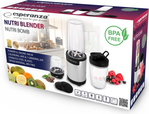 Den kraftfulde nutri-blender ESPERANZA Nutri Bomb med en robust motor udtrækker næringsstoffer fra frugt, grøntsager, nødder og frø. Perfekt til smoothies, supper, babymos og saucer – og kendetegnet ved et stilfuldt design til enhver køkkenindretning.