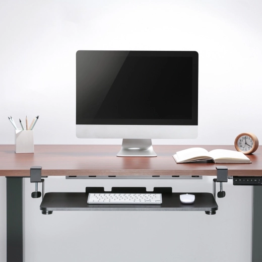 Den brede hylde rummer både tastatur og mus, frigør bordpladen og hjælper med at holde en overskuelig og organiseret arbejdsstation.