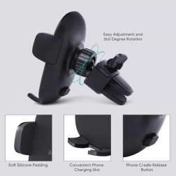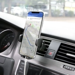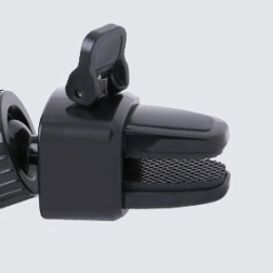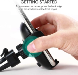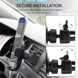 Den bredt justerbare kæbe med hurtigudløserknap muliggør lynhurtig indsætning og udtagning af telefonen. Kontaktfladerne er polstret med blød silikone, som dæmper vibrationer, holder telefonen uden at glide og beskytter den mod ridser. Fastgørelsesmekanismen er kompatibel med de fleste standardventilationer – den klarer både horisontale og vertikale lameller samt tyndere og tykkere riste.