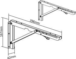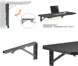 Universelle sammenklappelige vægbeslag, som der kan monteres en hylde på. Sættet af beslag kan bære en belastning på op til 50 kg. Den smarte og praktiske mekanisme gør det muligt at folde konsollerne ned og sænke hylden til lodret position, hvilket sparer plads efter behov.
