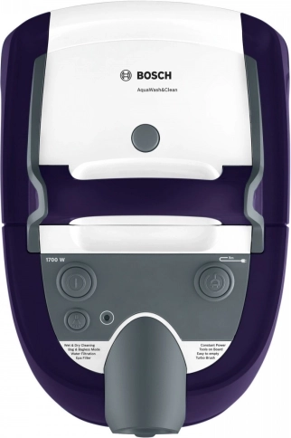 Støvsugeren Bosch AquaWash&Clean tilbyder våd- og tør rengøring med maksimal effekt på 1700 W. Den er udstyret med en turbobørste, som sikrer grundig støvsugning af tæpper.
