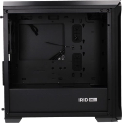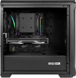 Kabinet Genesis Irid 503 V2 har perforeret frontpanel og sidepanel af gennemsigtigt hærdet glas. Sammen med de to Genesis Oxal 120 ventilatorer sikrer det fremragende luftcirkulation.
