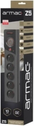 ARMAC Z5 er en alsidig overspændingslist med fem stik og effektiv beskyttelse af følsom elektronik. En varistor i topklasse reagerer på 25 ns og absorberer pulser op til 6000 A, hvilket beskytter udstyr mod farlige spændingsspidser. Den integrerede automatiske sikring 10A/250V muliggør nem genopretning af strømmen, når fejlen er afhjulpet.