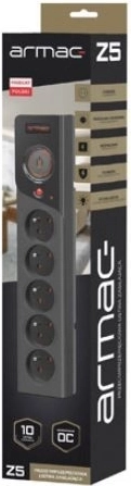 Den moderne og kvalitetsmæssige overspændingsbeskyttede forlænger ARMAC Z5 beskytter PC, periferiudstyr, TV/AV og multimedier mod farlige spændingsspidser. Den tilbyder 5 jordede stik, automatisk sikring 10 A, en højeffektiv varistor med reaktion < 25 ns, børnesikring Child Protection og smart kabelføring Free Cord. Den elegante topolige afbryder Quick Switch med diskret blåt baglys sikrer nem betjening.