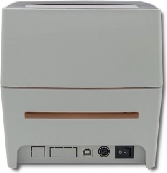 Qoltec labelprinter med elegant design og et orange element omkring knappen 'FEED' udmærker sig ved sin funktionalitet ved udskrivning af labels og stregkoder.