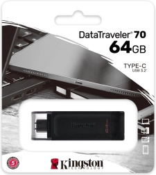 Kingston DataTraveler 70 er et praktisk flashdrev med USB‑C stik, ideelt til bærbare, tablets og smartphones. Takket være USB 3.2 Gen 1 håndterer det hurtig kopiering af dokumenter, fotos og videoer, og kapaciteten på 64 GB dækker almindelig daglig brug.